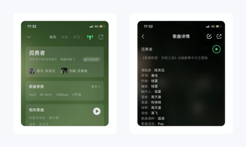 用户可以查看歌曲详细信息,包括歌手、专辑、发布时间以及详细的制作详情。