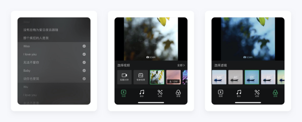 「歌词视频」相比高光视频,功能更丰富,首先不限制用户选择歌词数量,其次提供了风景、科幻、自然等不同主题的视频模版,而且还支持用户自己拍摄。用户还可以选择音乐播放的起点,添加视频动效和滤镜。通过这样短视频的方式吸引用户视频号以及更多的短视频平台,传播拉新。