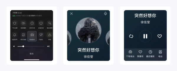 「驾驶模式」非常简洁,系统会自动检测用户听歌的环境自动切换。这个功能的设计充分考虑了用户驾车时候需要换歌的场景,提供了语音找歌、个性电台、我喜欢的歌单、最近播放和电台,省去了用户开车时候不方便换歌的痛点,用户体验非常友好。
