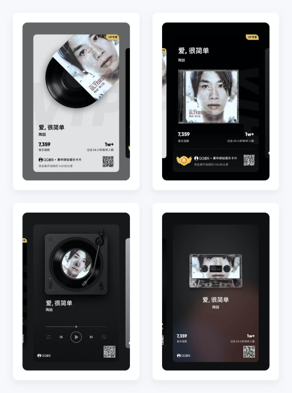 「音乐卡片」为用户提供了8种精美的风格,有复古怀旧的磁带、CD风格,有黑白胶唱机风格,还有专属的VIP会员专享风格。卡片内容包含歌曲的封面、歌名、歌手、音乐指数和过去24小时收听人数等信息,目的是为了吸引更多的用户扫码听歌,其次VIP会员卡片还加入了QQ音乐豪华绿钻音乐卡片标识,彰显VIP会员地位。