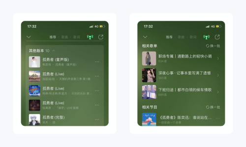 根据歌曲的曲风,平台会推荐相关歌曲,这有点像私人电台;其次平台还收录了歌曲的各种演绎版本,这真的非常方便,你可以轻松切换自己喜欢的版本;最后为用户推荐包含此歌曲的歌单、节目和视频,彻底抢占用户的时间。