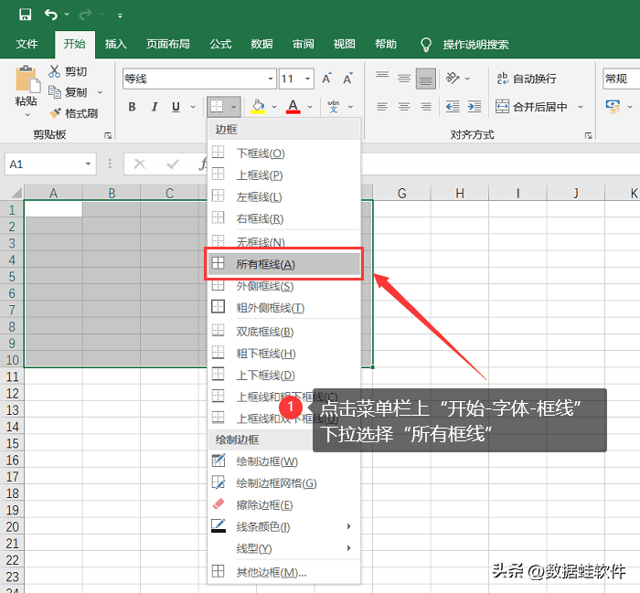 选中要设置的表格区域后,点击页面上方的【开始】。在【字体】栏目这里点击【边框】,在下拉的列表里面选择【所有框线】。