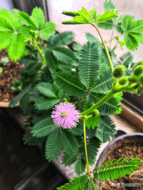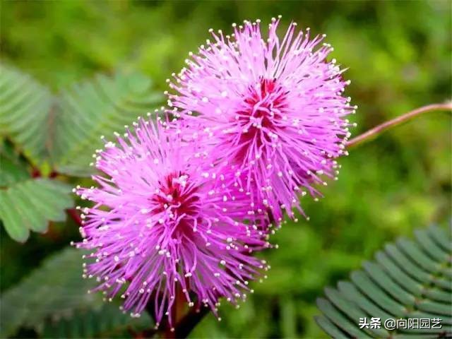 含羞草每年的夏天还会开出漂亮的花朵来,紫色的花瓣充满了诱惑,殊不知含羞草的花瓣散发出来的花粉,小蜜蜂都会离它远远的,球形的紫色花瓣就跟定时炸弹一样只要触碰到它就会爆炸,造成的后果非常严重。