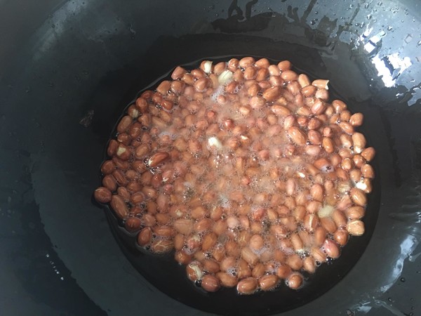 2.开火,在锅中放入适量的食用油,烧至七八分热,放入花生米炸干,捞出控去油份。