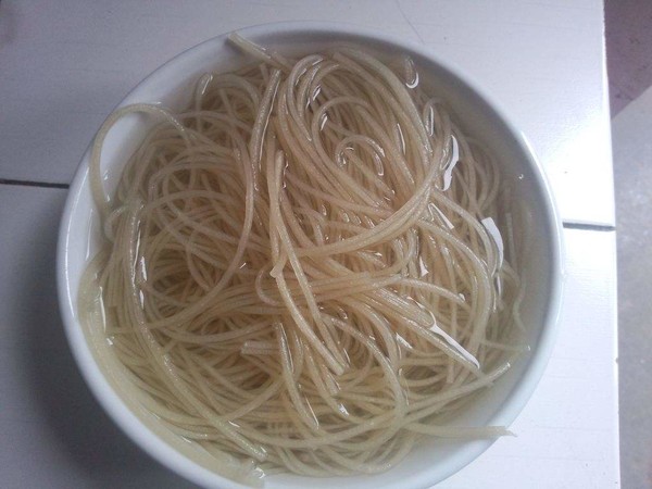 4.将水烧开后,在放入泡软的红薯粉,煮个五分钟左右在捞出放在碗中。
