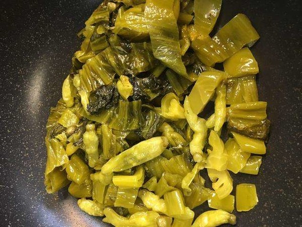 3.在放入适量的食用油,将切好的葱姜末爆炒一下,倒入干辣椒,芝麻炒香,加入切好的酸菜炒,在加入一碗开水烧开。