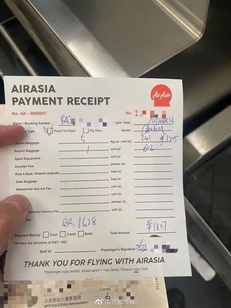 后来经过再次核算,白先生为超重的5公斤行李补交了1807元托运费。但他发现,对方只开了一个手写带有编号的纸条,纸条上有亚洲航空的标志,并没有盖章。在此期间,工作人员也未告知白先生托运行李的收费标准。