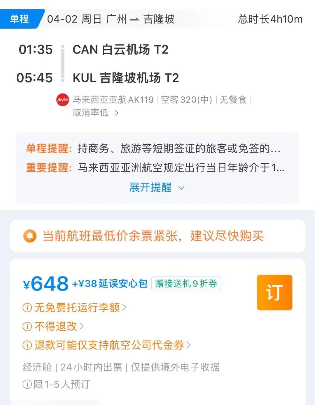 在旅行平台搜索发现,亚航广州到吉隆坡的单程机票售价为六百多元,而在出票页面,有清楚标注:“无免费托运行李额”。