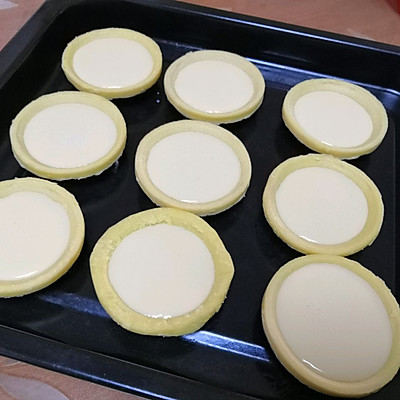 5、5.每个蛋挞皮倒入蛋黄液,8分满,如图。