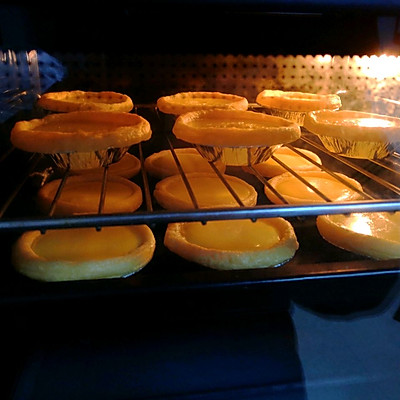 6、6.烤箱预热180℃,放进烤箱调回160℃烘烤,30分钟左右,中间要注意观察蛋挞烤的程度,切勿烤焦