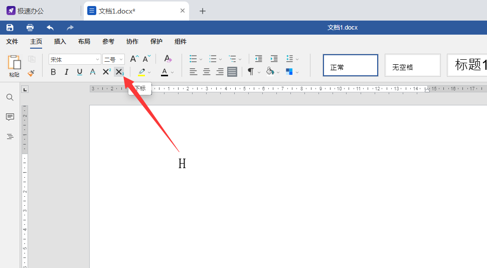 3,添加下标方法同理,添加一个化学名称为例,输入”H”,选择下标工具并输入数字2,如下图所示;