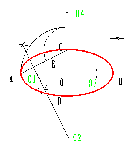 4.、以O1、O2、O3、O4各点为圆心,分别以O1A, O2C, O3B, O4D 为半径作圆弧。完成椭圆
