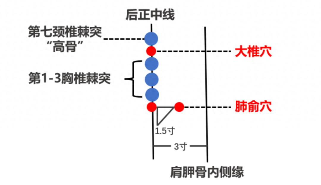 肺俞穴:背部,第3胸椎棘突下,旁开1.5寸。首先找到大椎穴,大椎穴向下数3个棘突,旁开1.5寸(肩胛骨内侧缘与脊柱正中线之间为3寸,中点为1.5寸)。