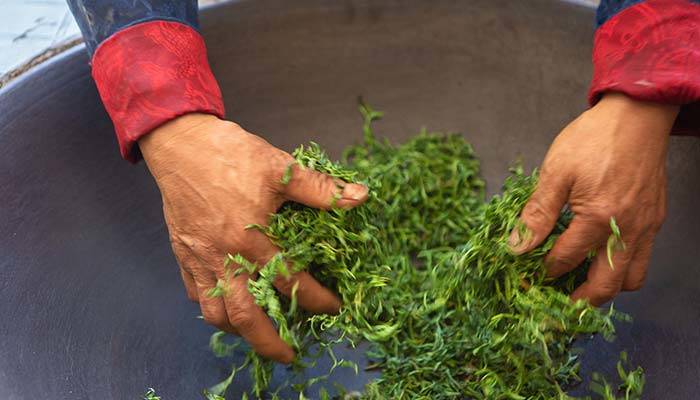 “做形”工序是决定外形品质特征的重要环节,其操作法是将三揉叶投入锅中,用双手将锅中茶叶抓起,五指分开,两手心相对,将茶握住团揉4~5转,撒入锅中,如此反复数次,待茶叶含水量减至15~20%时,略升锅温,双手加速团揉,直到满显白毫,再经过初烘、匀小堆和复烘达到足干,匀拼大堆后,入库收藏。