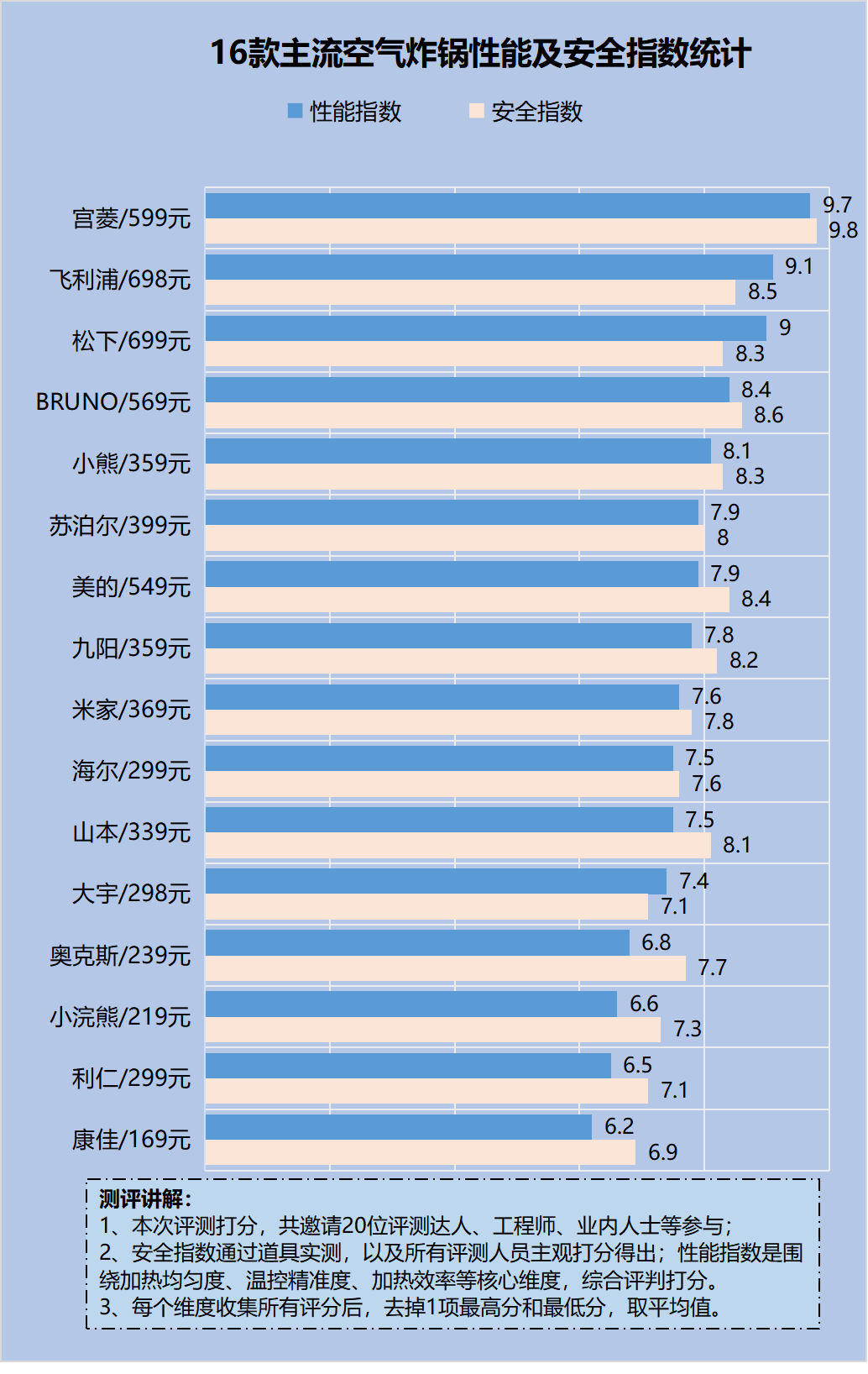 空气炸锅到底是黑科技还是智商税?通过上述给大家总结的常见的四类智商税产品,相信大家都已经了解了,大家在购买的时候一定要注意避雷。市面上有很多宣传出来的优质产品,但真正专业好用功能强悍的产品,还需要大家用心去寻找。为了帮助大家找到真正好用的空气炸锅产品,我给大家分享一张全网16款主流空气炸锅安全及性能评分图,供大家参考: