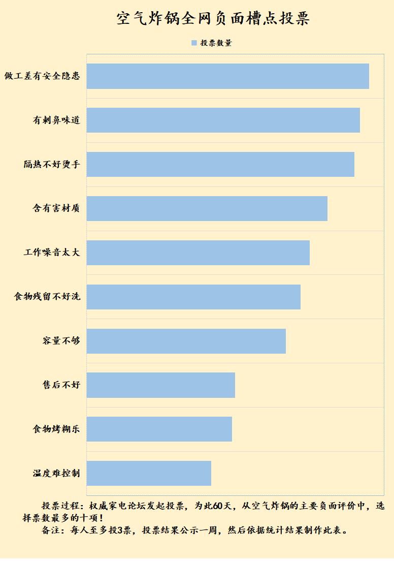 空气炸锅到底是黑科技还是智商税?通过上文的科普,相信大家对于空气炸锅的优缺点都心中有数了,至于是黑科技还是智商税还是取决于我们能不能选到优质专业的空气炸锅。如今,市面上有很多劣质产品,一些消费者在不了解产品的情况下很容易因为铺天盖地的宣传而被忽悠购买到劣质产品。下图是一张空气炸锅负面评价图,几乎涵盖了空气炸锅的所有槽点。根据这张图给大家总结了市面上常见的四类商家套路,大家可以收藏一下,有助于帮助自己在购买的时候避雷: