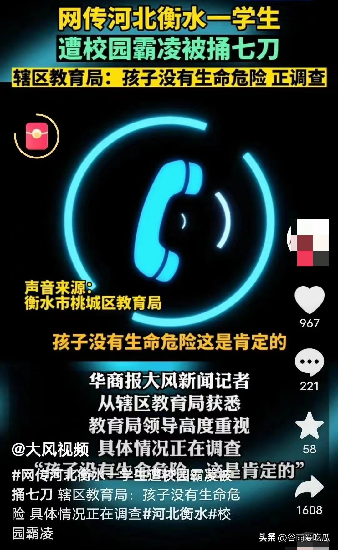 “衡水桃城中学初二学生于某在校期间遭遇校园霸凌,被捅七刀”。