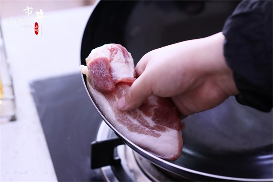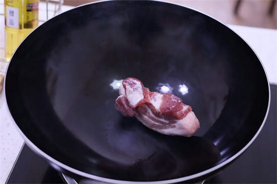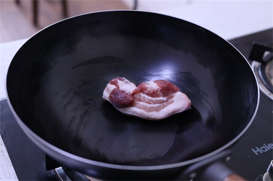 5、铁锅重新放到火上烧干,开小火,拿一块肥肉,将锅的每一个部分都擦上油脂,小火烧到冒烟。