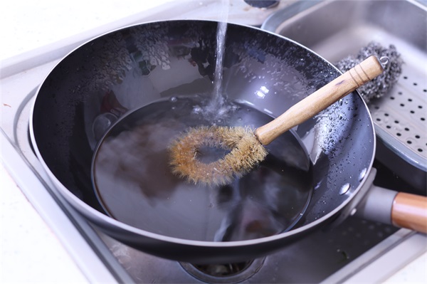 1、彻底清洗铁锅,将铁锅放在水龙头下,放入一些清洁精,用硬质的刷子或丝瓜瓤里外都认真地刷洗几遍,主要是清除掉杂质和一些机械油。