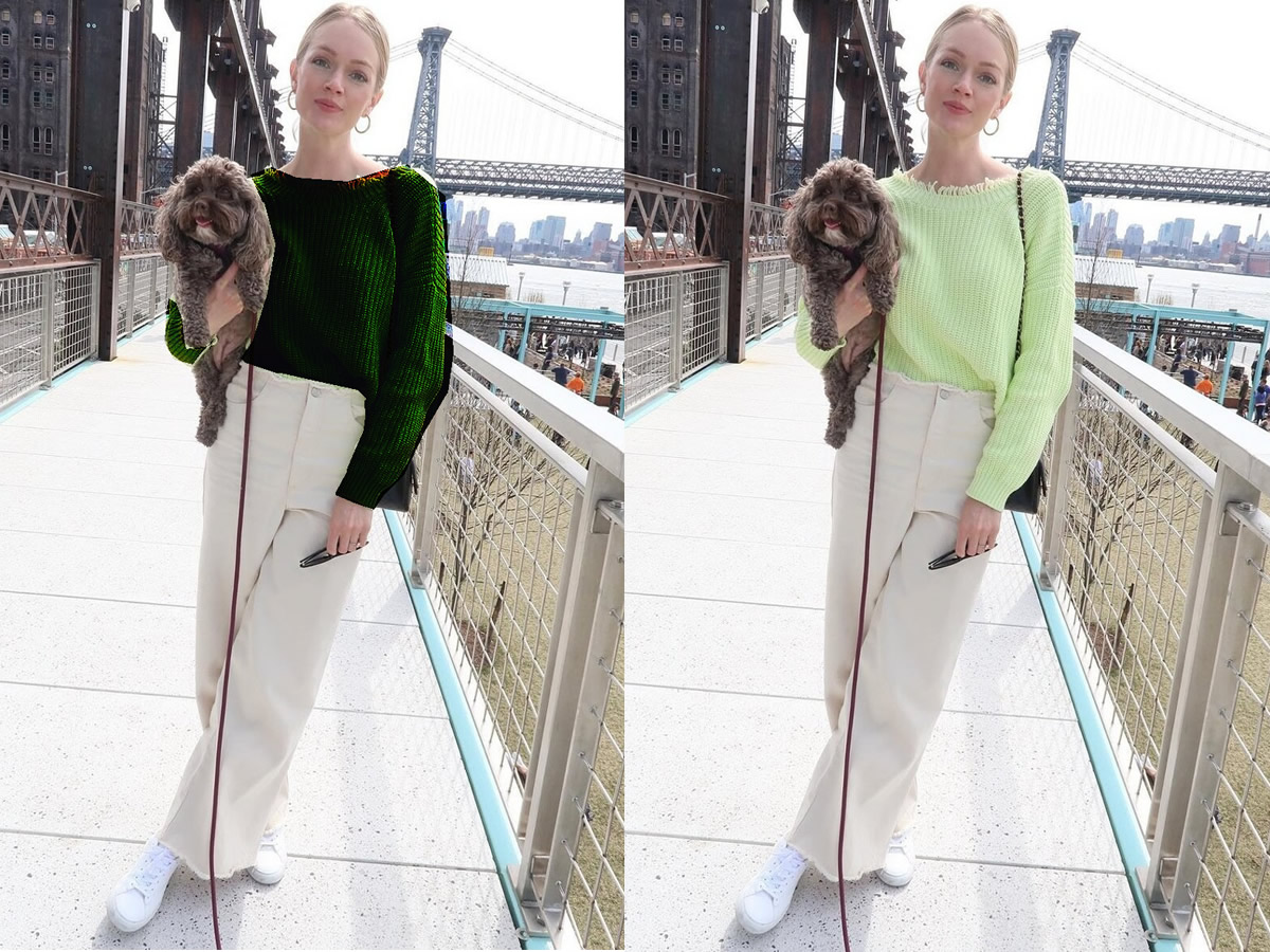 米的色裤子是很清爽的一条裤子,看着干净简洁.那在搭配上就不要选颜色太深的衣服.这样会减弱米色的清新感.让人有一种厚重沉闷的感觉.比如上图,明显右边浅绿色色毛衣和米色直筒裤组合更好看,显得清新又明快.很有春天的感觉.而左图的深绿毛衣则显得上半身太重,不过还蛮显人白的.