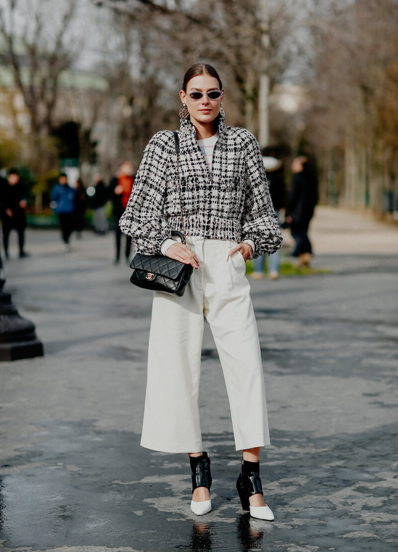 天气一热,厚重的衣服就看起来有点土气.米白色的裤子也不宜和面料厚重的衣服搭配.那样整体不怎么和谐。显得厚重又沉闷,感觉不是当季的衣服.比如一件厚重的毛呢外套和米白色的直筒裤或阔腿裤组合,就不好看.虽说黑白格纹和米色搭配不错.但明显上半身很重.不怎么顺眼.