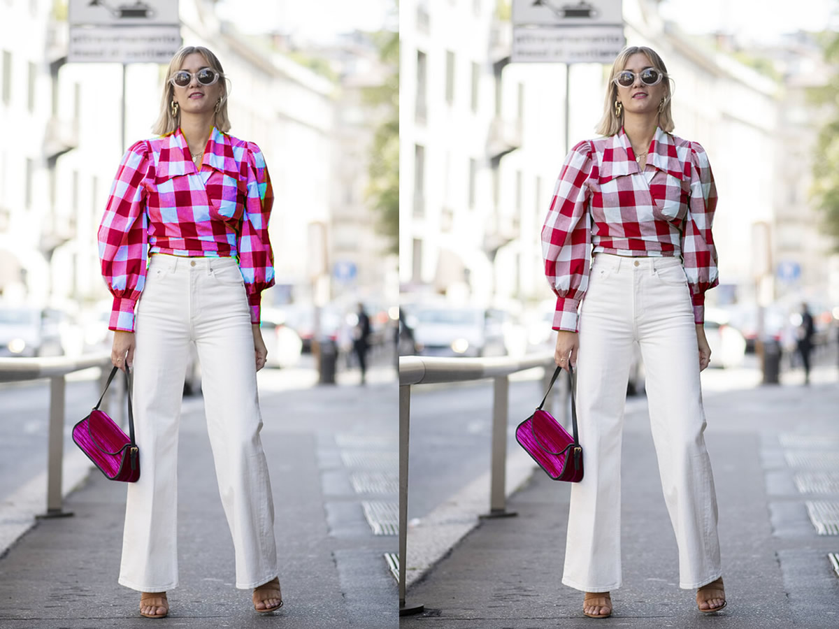 米色裤子虽说很百搭,但有的颜色配起来是高级又清爽.而有的颜色配起来,只能是刚刚及格.穿米色的裤子时最好不要和饱和度高,明度又高的上衣搭配,那样虽然也不算难看,但高级感欠缺。看上图就很明显.右边带点灰调的,饱和度低的玫红格纹比左边鲜艳玫红格纹上衣大气得多,也更有高级感.左图就显得俗气多了.