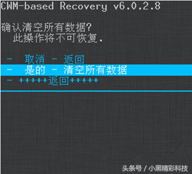 再选择yes – delete all user data指令,中文意思是“是的–清空所有数据”,确认即可开始进行恢复出厂设置。完毕后再选择“reboot system now”指令进行重启手机即可。此时就完成所有操作了。