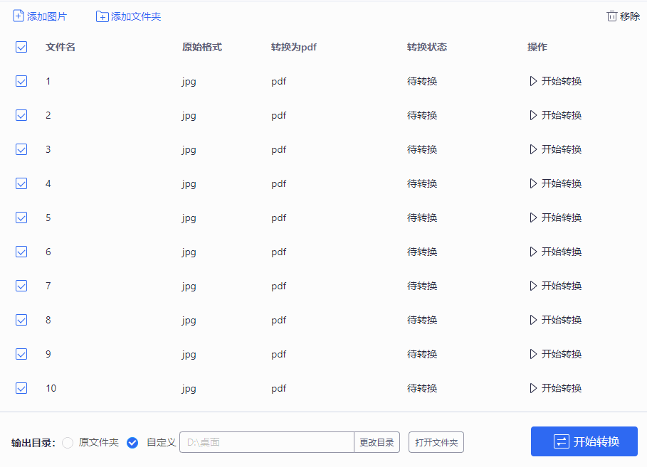 将图片添加到工具上之后,直接点击右下角的【开始转换】按钮,设置纸张大小、方向、边距,输出方式选择【合并输出】,就能将多张图片转换为单个PDF文件了。