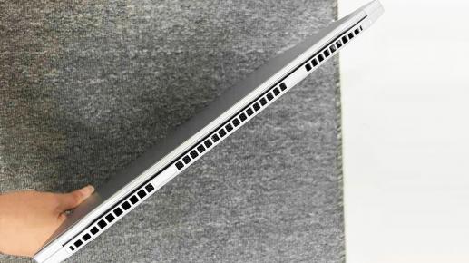 翻转到机器的d面,同样是机械革命传统的家族式设计。这个设计将底部外壳分成三个区域和元素点,一是处在机器转轴处的散热孔,在一块矩形区域里开了大量密集圆孔,看着很有金属美感;其次是位于机器外壳上下边缘处的橡胶条,分成两根,作为底座支点,防滑效果明显,但很容易沾染污渍,且无法清除。最后是机器的扬声器,也是在面板左右边缘开了孔位,面积很小,功率和效果不错,影音娱乐时感受明显,至于设计师和程序员,实际使用频率有限。