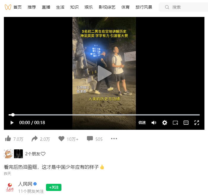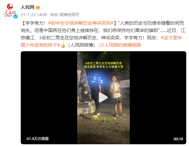 这是一段充满情怀、慷慨激昂的视频:夜幕下西津渡一处空地上,游客环绕四周,一位身穿白色T恤、背着书包的少年面对游客,饱含深情地大声说着:“人类的历史与功绩会随着时间而消失,但是中国将在他们身上继续存在,我们将保持他们高举的旗帜!”视频里周围游客大声回应:“好!”“棒!”并报以掌声,视频拍摄者吴女士旁白:“没有想到我在这边旅游的时候被初二的学生给感动哭了。”