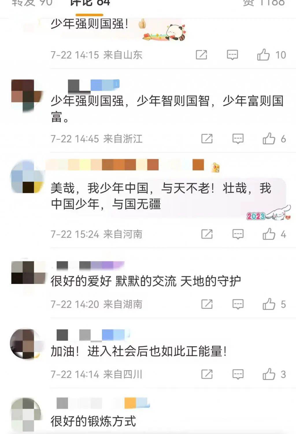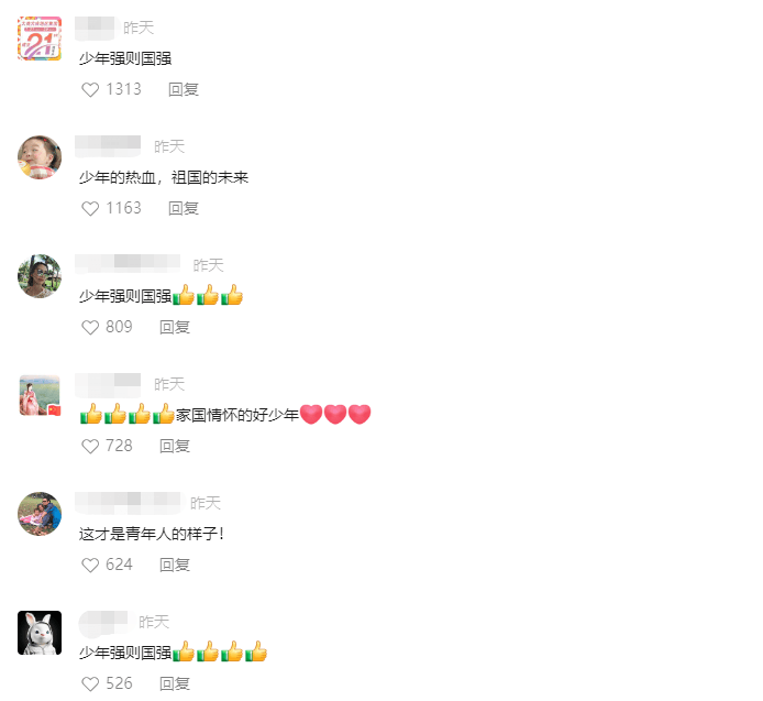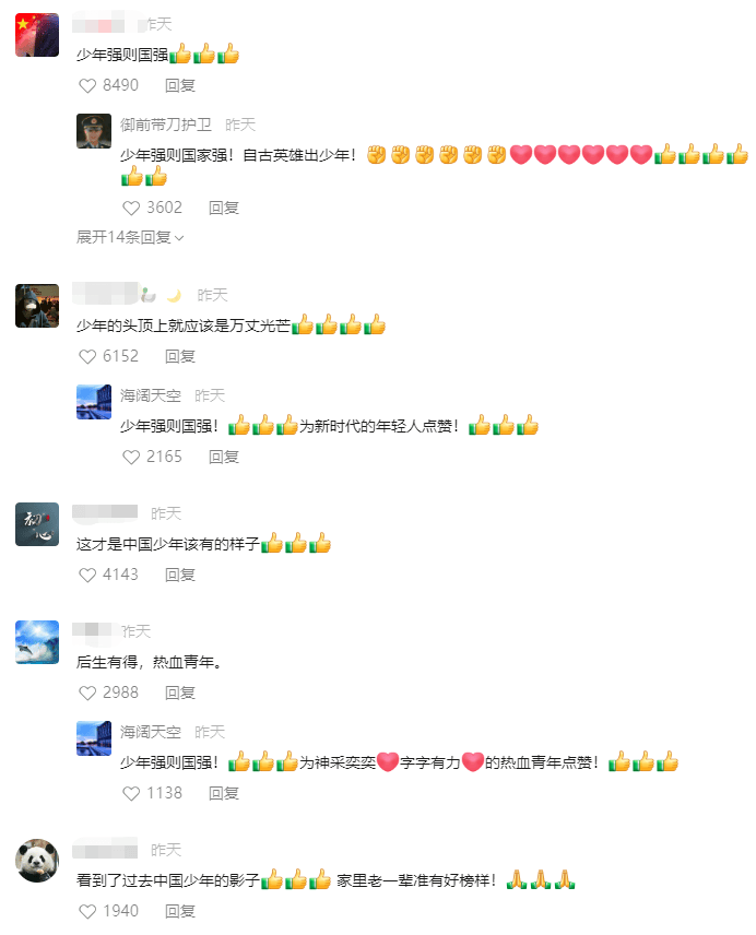 “少年强则国强!”“加油、进入社会后也如此正能量!”“美哉,我少年中国,与天不老!壮哉,我中国少年,与国无疆!”……