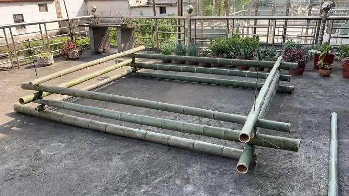 在他二楼的阳台上,他用山上12根竹子、几根螺丝、废弃的床单和布搭建了一个2米乘3米的游泳池,不仅可以让四五个孩子一起打水仗,还可以让一个成年人用游泳池完成花样跳水。
