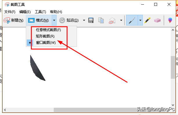 2.选择截图形状。程序会默认选择“矩形截图”。点击“模式”按钮旁边的箭头来更改截图形状: