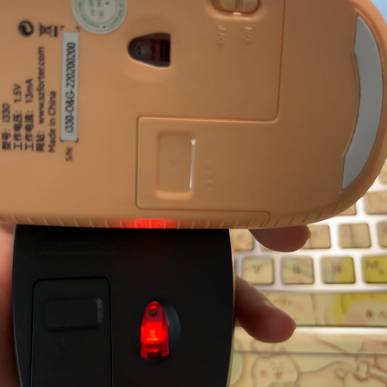 与此同时,我们要先检查检查鼠标背后的开关有没有打开哦:ON是打开的意思,而OFF是关闭状态。