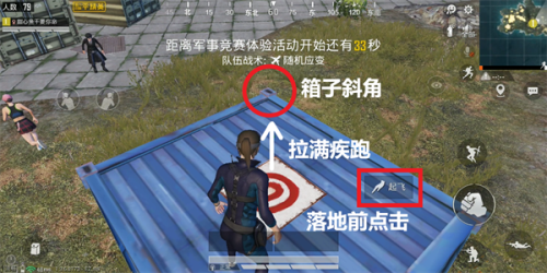 第三步,拉满疾跑往这个斜角冲刺,不要点跳跃,等人物离开箱子的瞬间,点击“起飞”按钮。