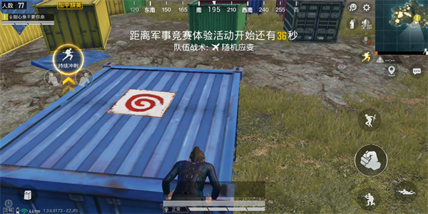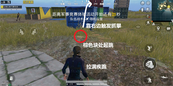 往后拉开距离,拉满疾跑,当人物跑到棕色块处点击跳跃起跳,往集装箱靠右边跳,这样距离足够,跳到集装箱边上的时候,点击跳跃触发抓攀系统爬上去。