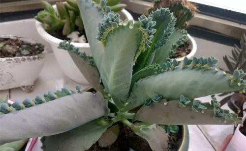 不死鸟又叫落地生根,它最大的特点就是,叶子边缘会生出无数小崽崽,等小崽长大出根后,落在地上就能生长成新植株。