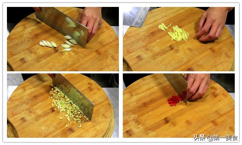 3.下面我们把配菜处理一下,大葱一段切成葱花,生姜一小块切成姜丝,大蒜一把拍扁后切成蒜末,小米椒几个切成小粒。