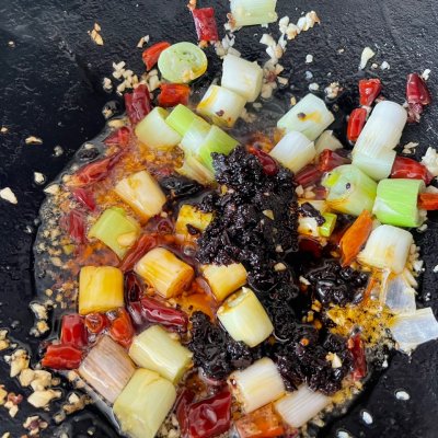 5、5.锅热下油,炒香蒜蓉,放入干辣椒、姜、大葱、花椒和香辣酱,翻炒。