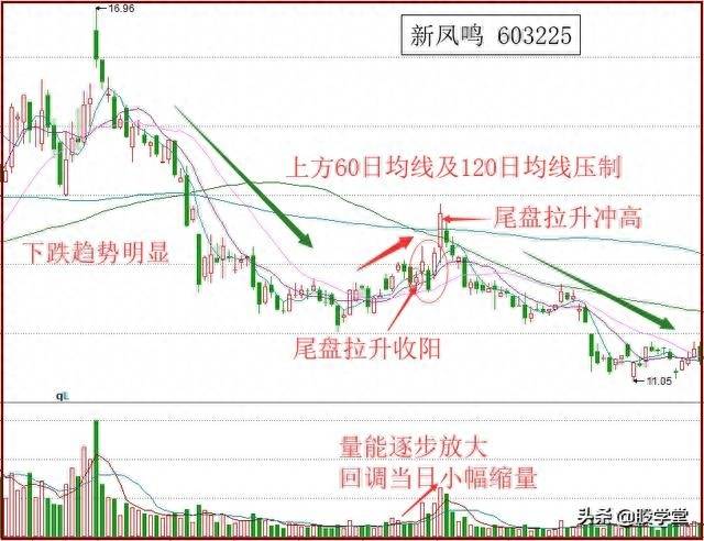 首先,当时的量能并没有走出我们前面所说的明显缩量,在该形态形成前,已有两日阴线回落,然后强行收出一根尾盘拉升的小阳线,随后一日股价冲高回落。其次,此时上方60日均线压力较大,而且个股下跌趋势还未结束,因此,即使在调整反弹后介入,也应该在次日尾盘冲高时出掉。