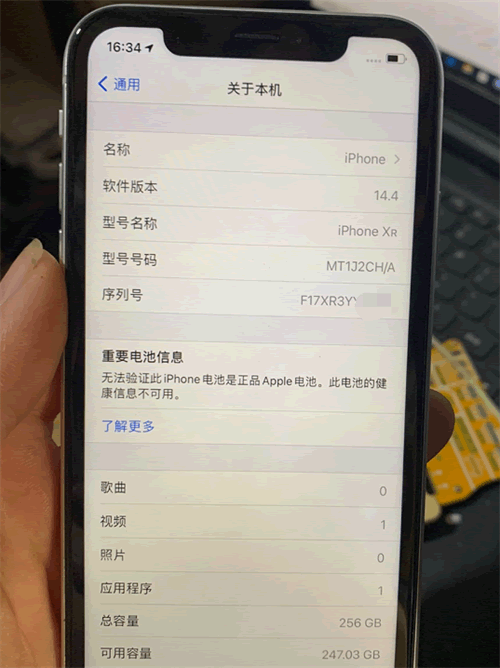 关于本机显示这是一台国行iPhoneXR,内存是256GB,同时提示电池是换过的。