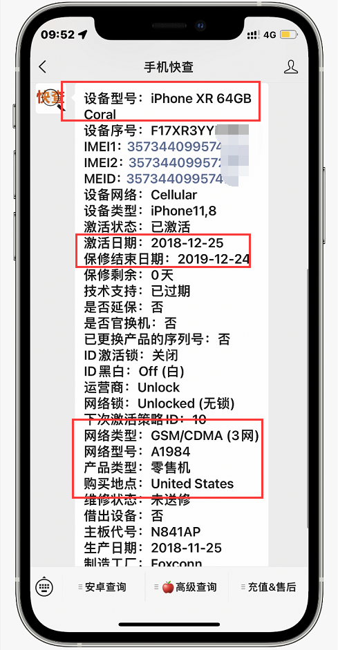 这是整机报告截图,我们可以看到这台iPhoneXR的原始内存是64GB,颜色为珊瑚色。但我们从关于本机和验机报告中看到的是256GB、白色。说明这是翻新机、扩容机。但验机报告并没有验出异常数据,说明改了底层数据。原始销售地是美国,并不是我们想要的国行,说明这是改了数据的。这是一部假国行,只有销售地是china,才是真国行。