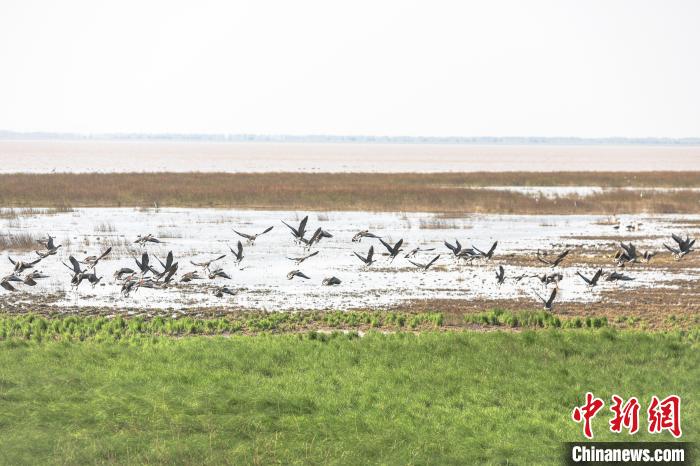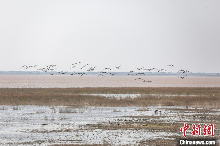 图为不少候鸟在鄱阳湖国家级自然保护区核心区大湖池湿地上方飞翔。 刘力鑫 摄
