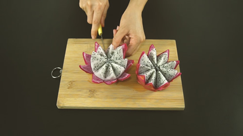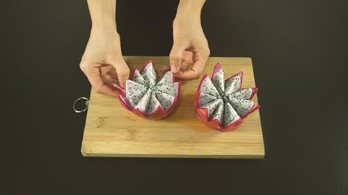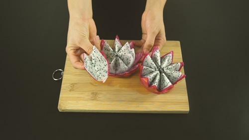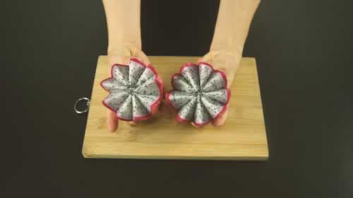 这个火龙果的创意切法大家都学会了吗?其实方法非常简单易学,我们只需要在中间不断地切三角形就可以了,最后环绕一周就轻松完成了,切的过程中记住不要切得太大哦,否则切出来就不好了。