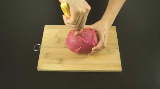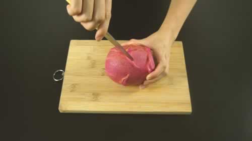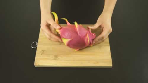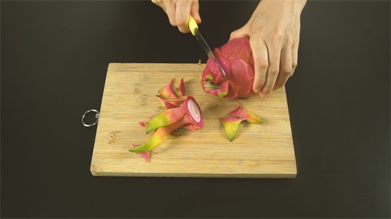 先在火龙果的中间把刀斜插进去,然后再斜着下刀,形成一个三角形的感觉,最后环绕一切切割完成就可以了!