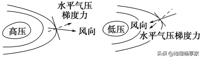第一步,在等压线图中,按要求画出过该点的切线,并作垂直于切线的虚线箭头(由高压指向低压,但并非一定指向低压中心),表示水平气压梯度力的方向;