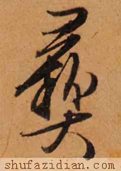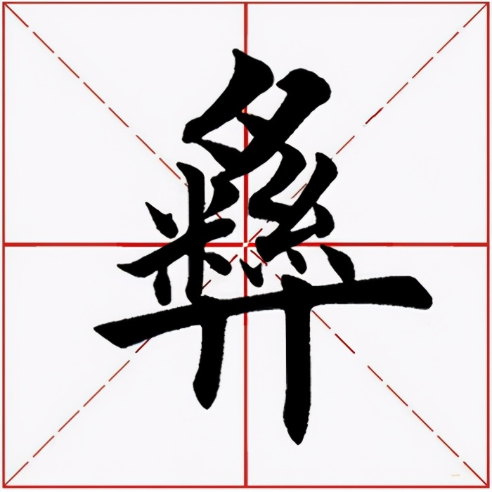 中部紧凑抗肩,不要写重。左边“米”字斜势抗肩:上面点、撇两笔左低右高,紧凑呼应;横画起笔左探,大抗肩,右边要收;竖笔高起,竖身勿重,劲挺有力,下面勿长,垂露收笔;下面撇、捺写成两点,注意偏左,勿重。右边“糹”上收下展:要注意两个撇折的写法和变化,第一个撇折撇笔起笔稍重,折向右下方;第二个撇折撇笔长、直,折后向右上方提出;右点靠上,稍立。下面写成三点,注意位置和角度,不要写重。