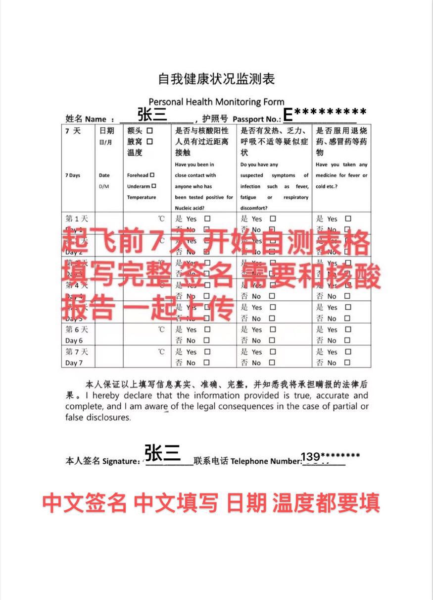 3.日期:不用写年月日,就用数字就可以。例如11月26日的航班,就要从11月19日开始填写。直接写11/19就可以了。有很多人会问出发前7天含不含出发当天呀?这个也不用算,就从你开始做第一次检测的日期开始填,填到你出发前的那天,就一共七天了。