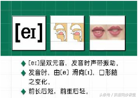 [ei]是合口双元音。舌位:先将舌尖抵住前下齿,舌前部向硬腭抬起,高度为中高,先发元音[e], 然后两唇拉向两边,使口腔宽度减小,同时舌身高度抬至[i]的高度,在这一滑动过程中形成[ei]音。声带:振动。
