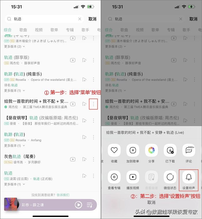 步骤1:打开某一款音乐播放器后选择一首歌,点击这首歌的【菜单】按钮后找到【设置铃声】并点击;